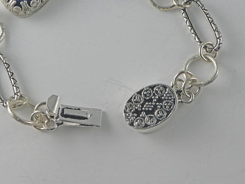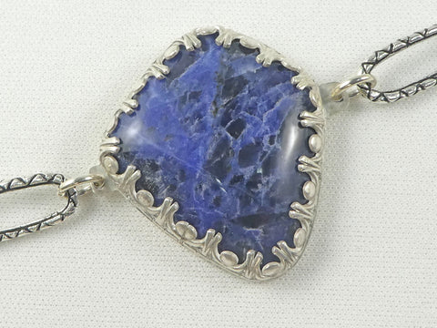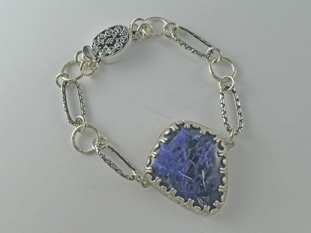 A beautiful free form natural sodalite stone is set in a special gallery wire bezel, creating a unique look! But that's not all this bracelet offers; the beautiful links are a combination of round and oval links, and the clasp is a nicely detailed oval design with a positive click clasp so you never lose this one!