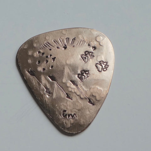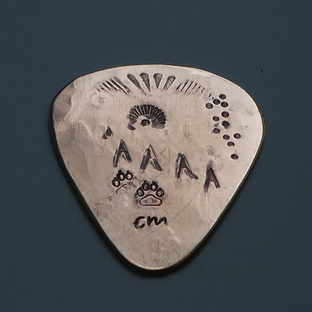 These picks are solid copper, and are individually hand stamped by me in my studio. Each has a southwest pictograph, and each one is different, so yours may not be identical to the photo, but will have similar stamping patterns. Both sides of the pick are stamped.