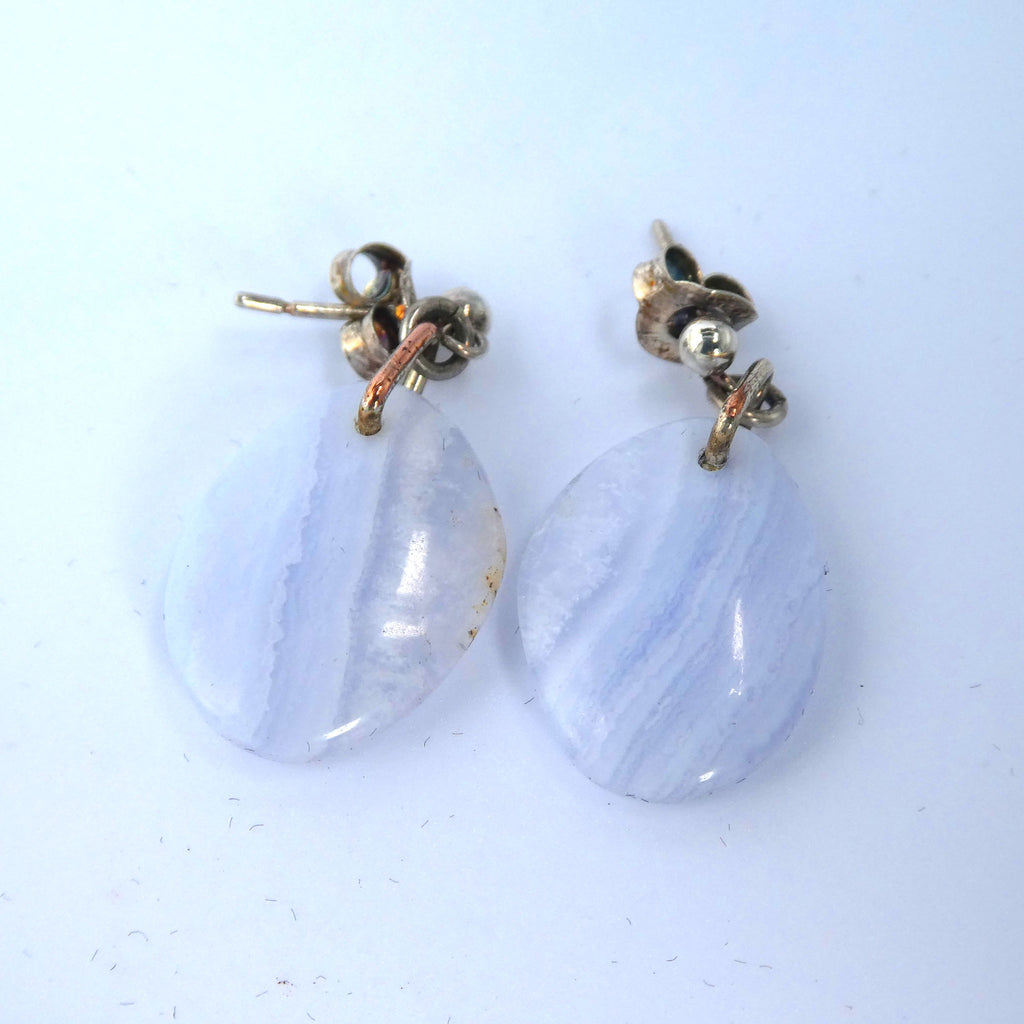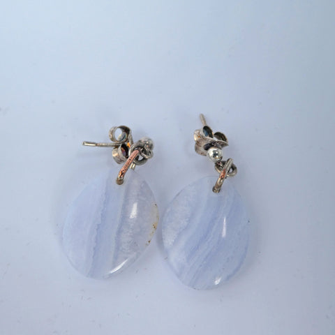 Blue Lace Agate is a variety of Chalcedony, a family of light blue magical stones! This pair of earrings has a pretty, light color of blue, and are a post earring with a dangle.