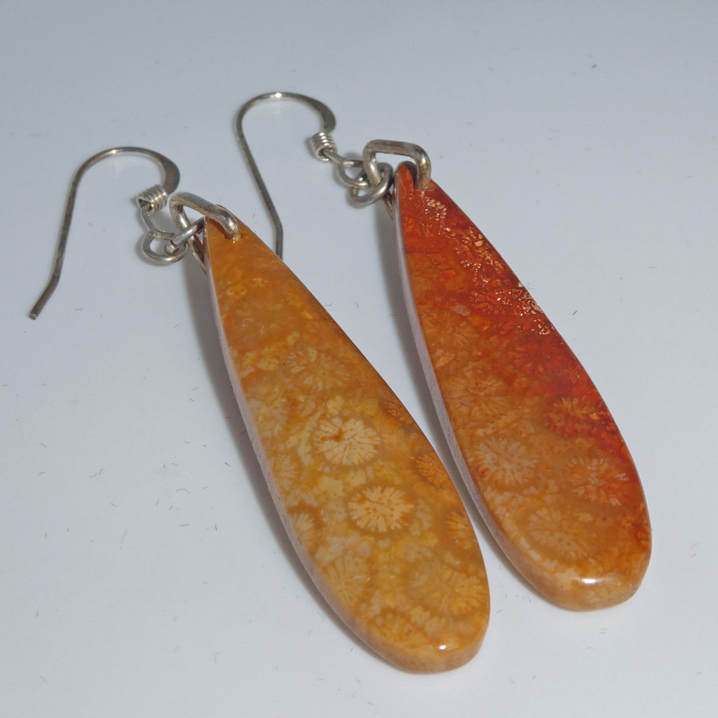 These fossil coral earrings are natural stone, with sterling silver ear wires. They measure 1 1/2 inches in length.
