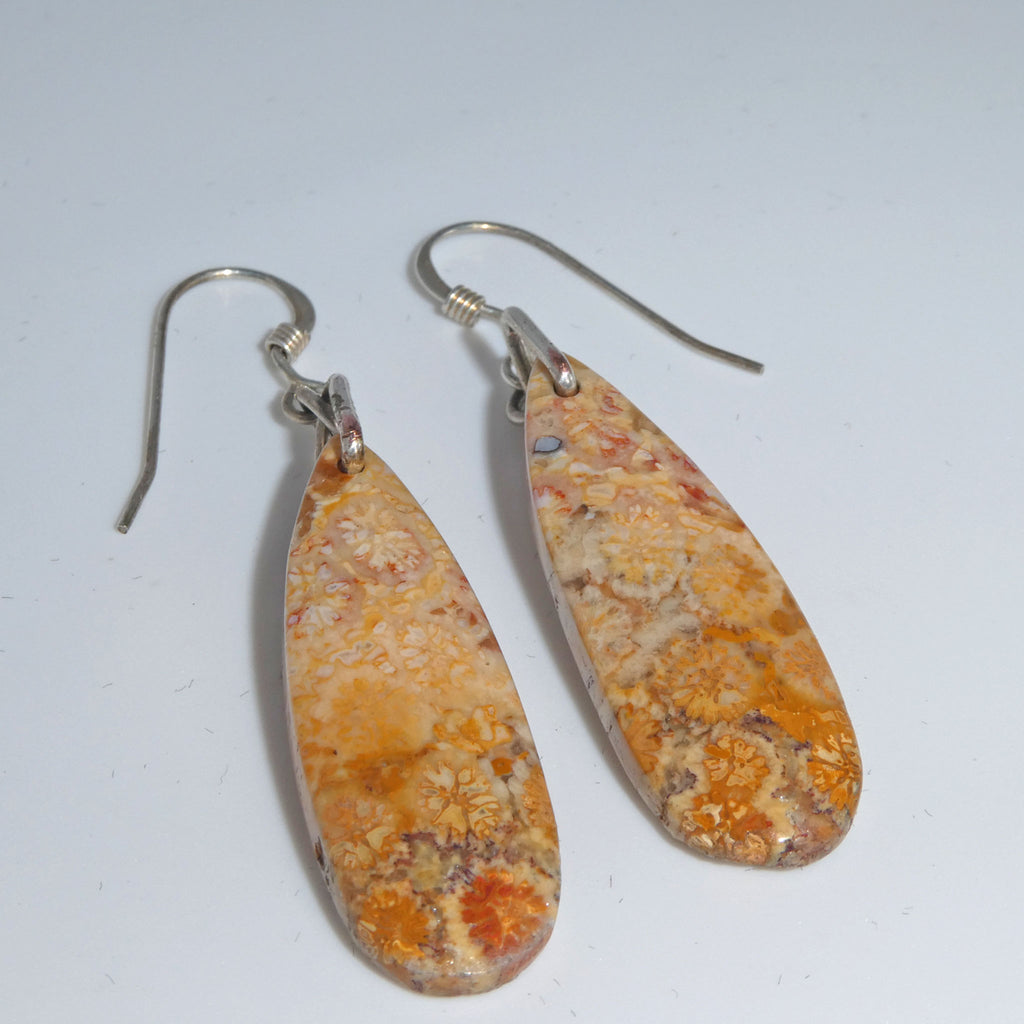 These pretty fossil coral earrings are all natural stone, hung on sterling silver ear wires. They measure one inch in length.