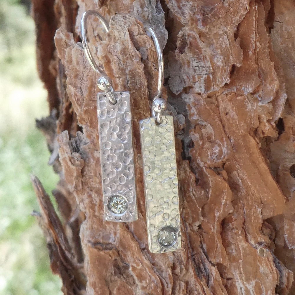 A periodot CZ is flush mounted into a solid piece of .925 sterling silver, which has a hammered texture. The ear wires are simple sterling ball hooks.