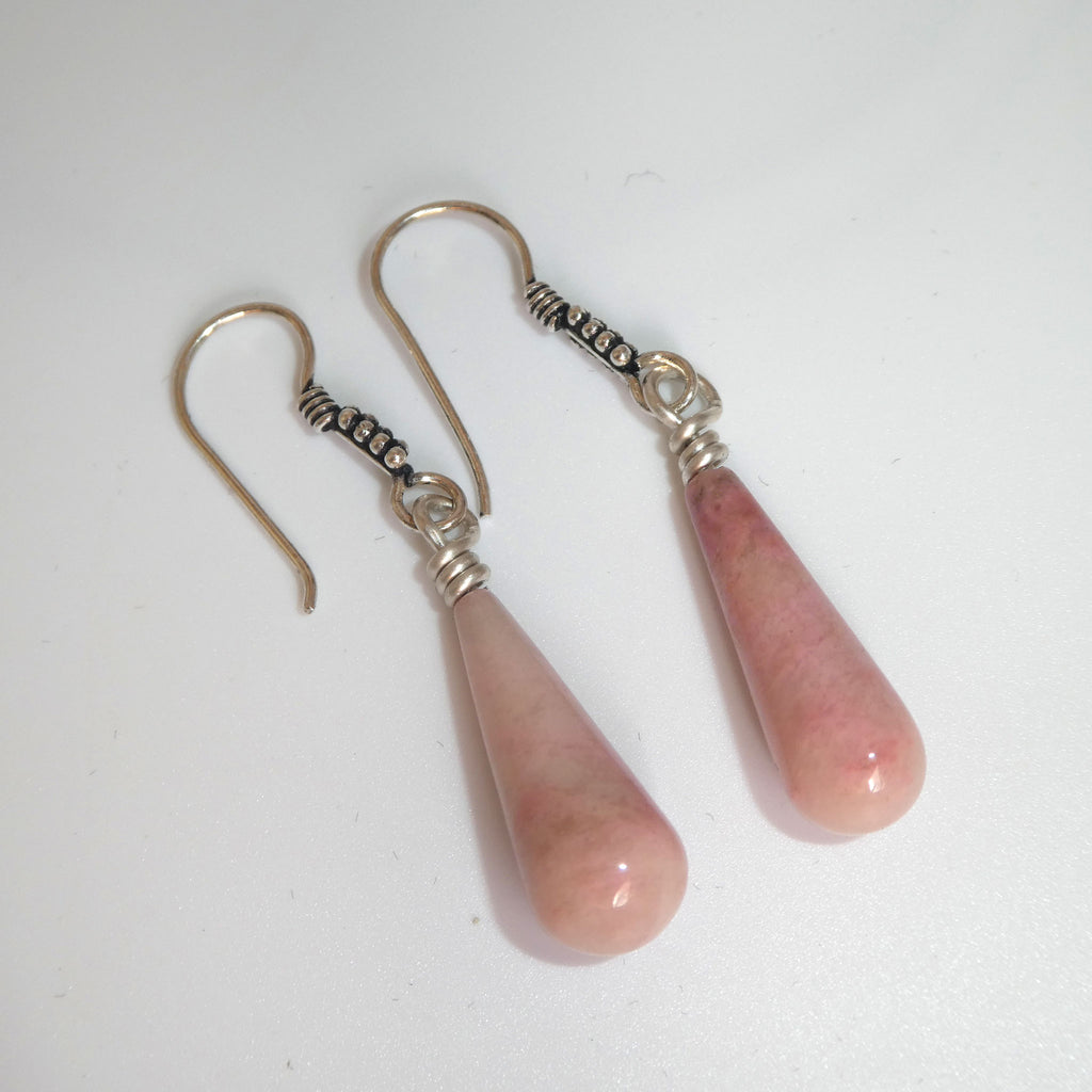 The pretty pink Rhodochrosite droplets are one inch in length, hung from a pretty beaded sterling silver ear wire. There are not too many pink natural stones, but Rhodochrosite fills the gap for that special outfit!