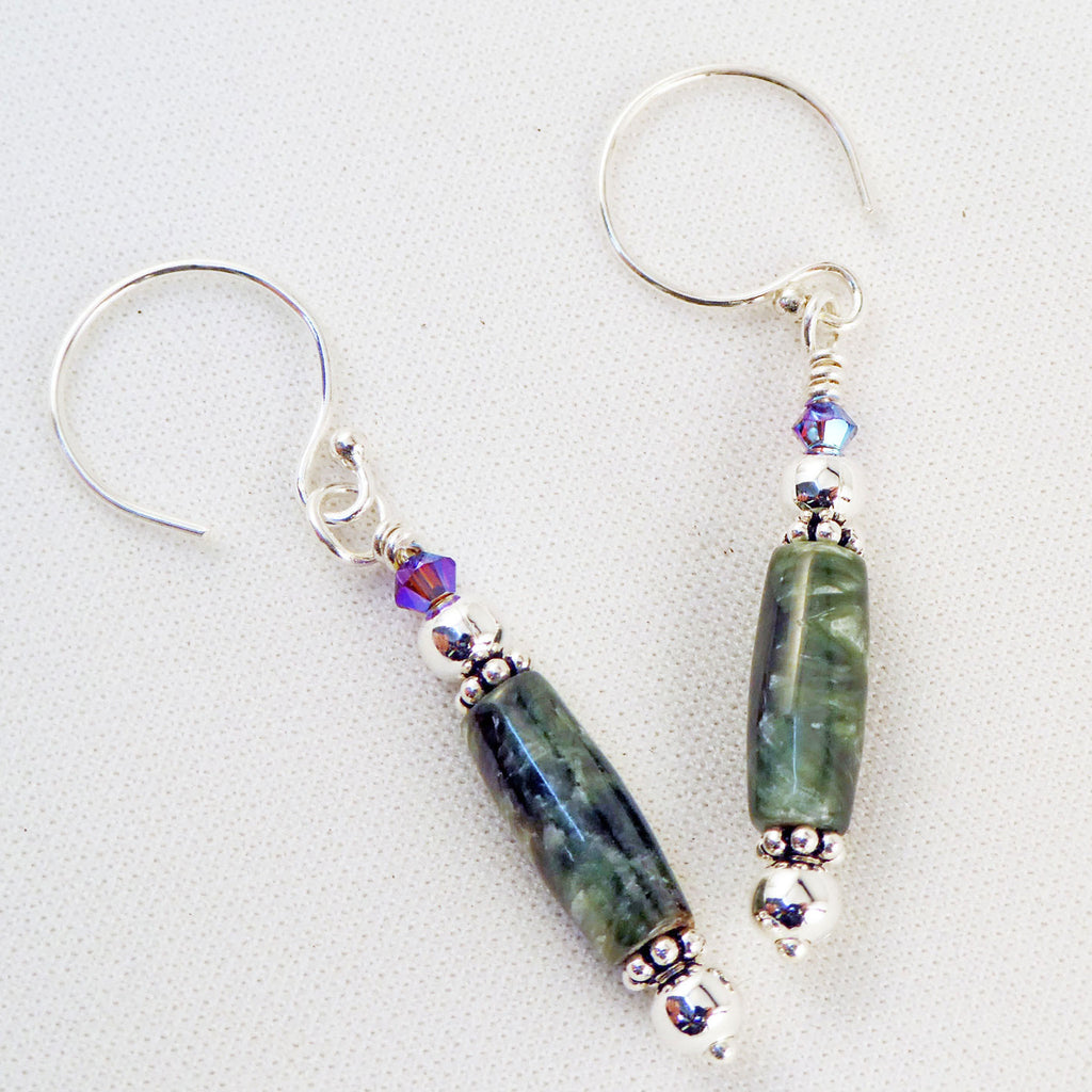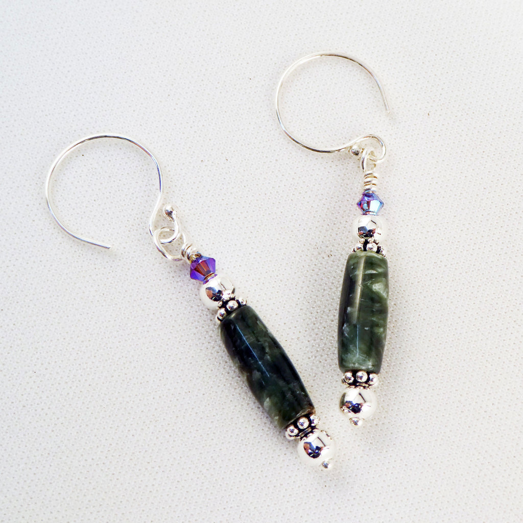 Serephenite is a beautiful green stone that is named after the biblical seraphs or seraphim angels. These earrings combine a barrel shaped bead with purple Swarovski crystals and hung from circular sterling silver ear wires.