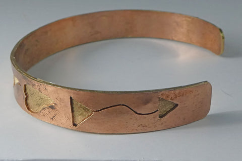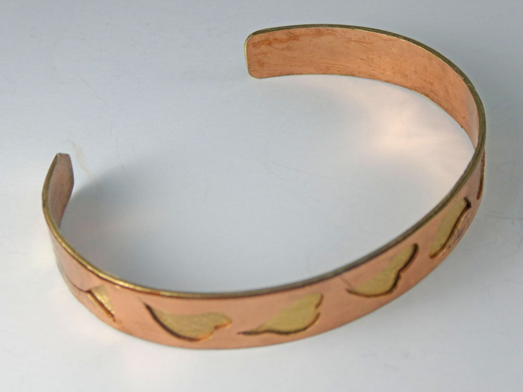 This is an original design overlay bracelet with bronze and copper. it is a narrow cuff, measuring just under a half inch wide. The diameter is generous, and will fit approximately a six and one half inch wrist, including an inch and one quarter opening.