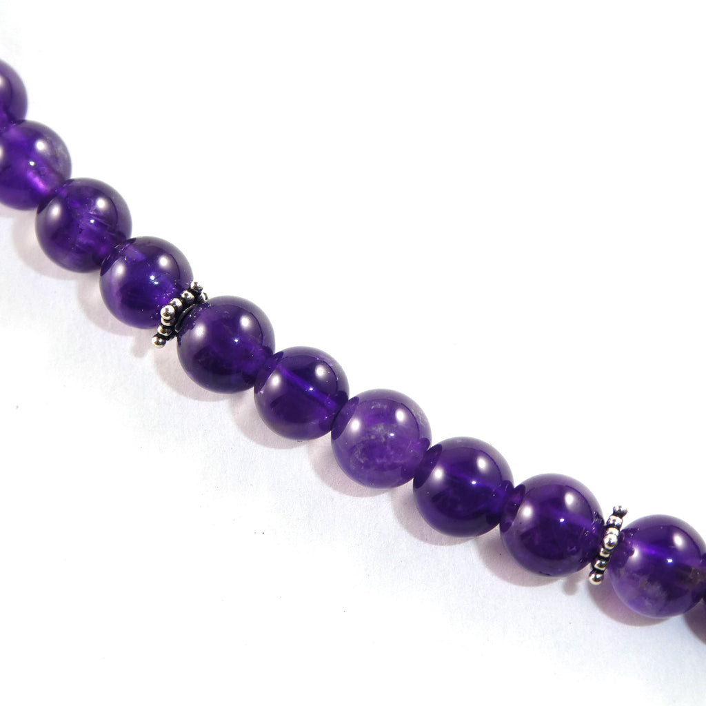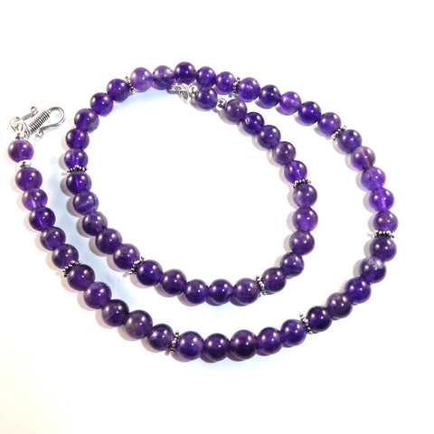 Round amethyst beads with sterling silver spacers, finished with one sterling silver offset beading and a sterling silver S clasp. The necklace is 16" in length.