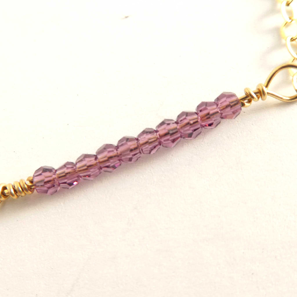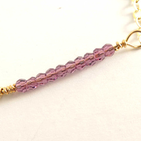 The bar necklace design has been popular recently; this is made with Swarovski crystals in an amethyst color, and the necklace chain and findings are gold fill.  The necklace is 16 inches in length, and the beads are 2mm each, total length of the bar is one inch.