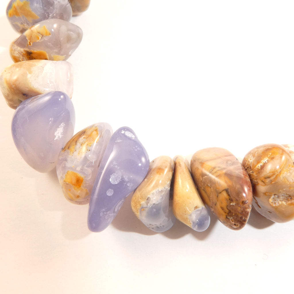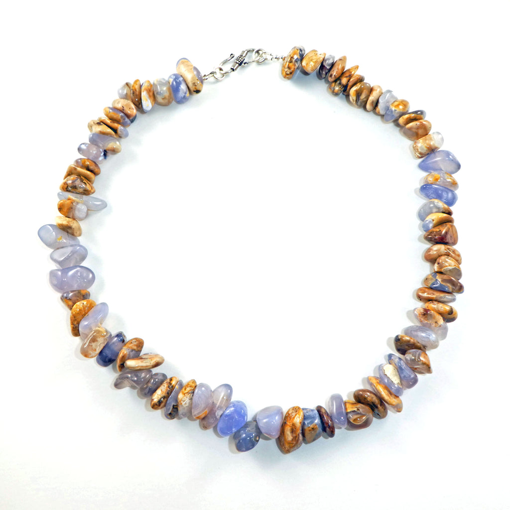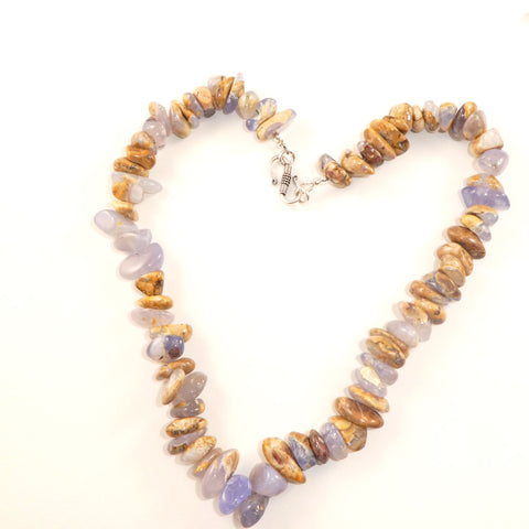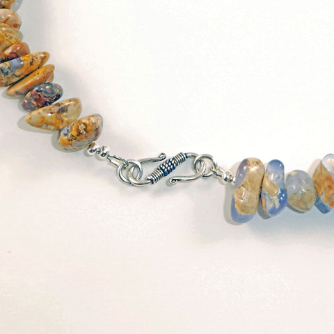 There was never a more perfect color combination for wearing with your denim! This beautiful polished natural Chalcedony strand has been hand strung 16 1/2" long, with a solid sterling silver S hook clasp.