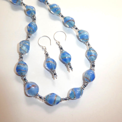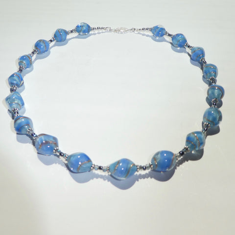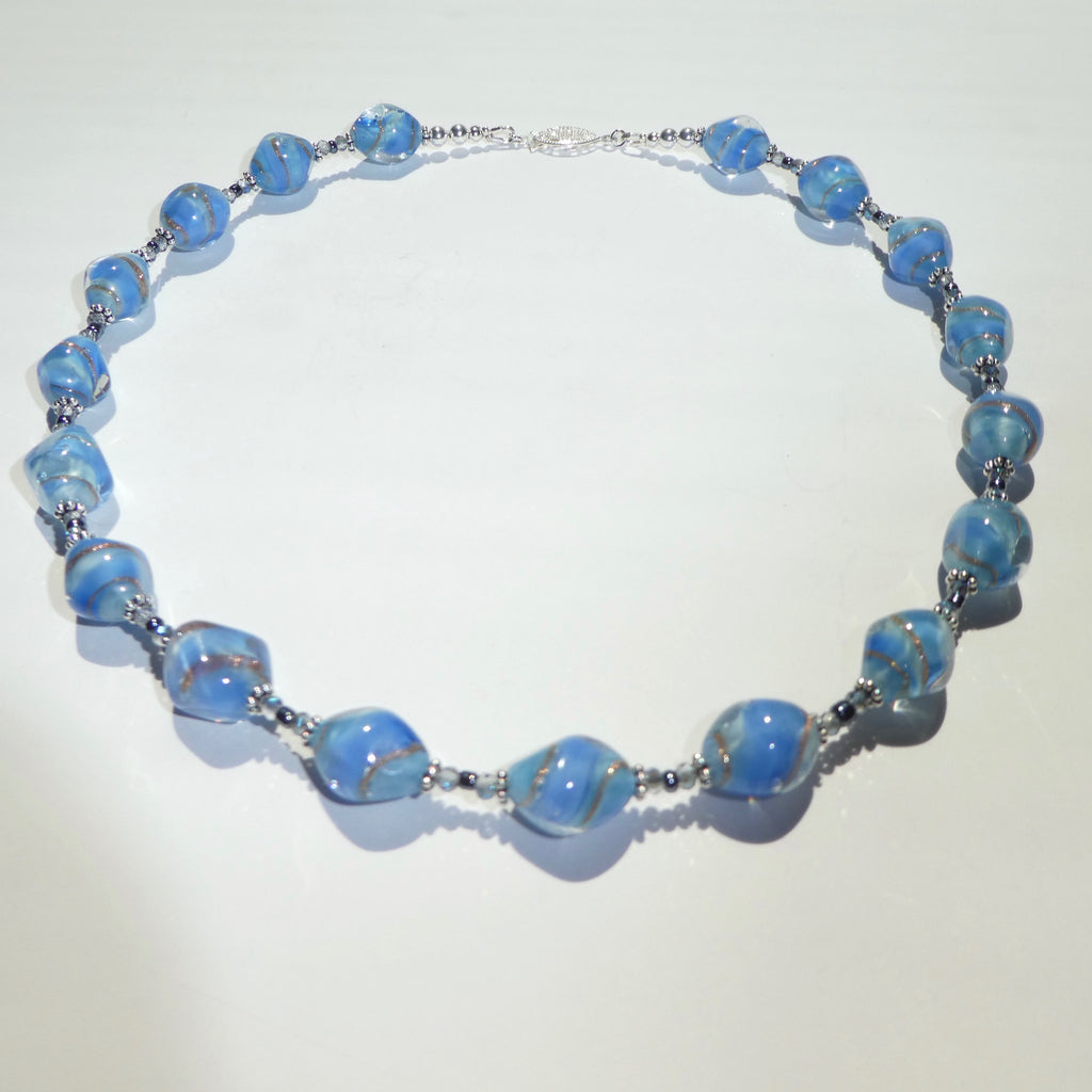 Aren't glass lampwork beads beautiful? These beads are vintage, and are a soft baby blue color with silver ribbons. Each bead is about 3/4 inch in length, and in between are darker blue seed beads and Swarovski crystals for a lacy look.