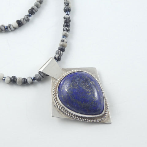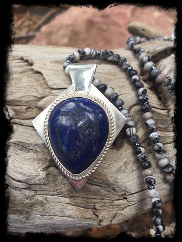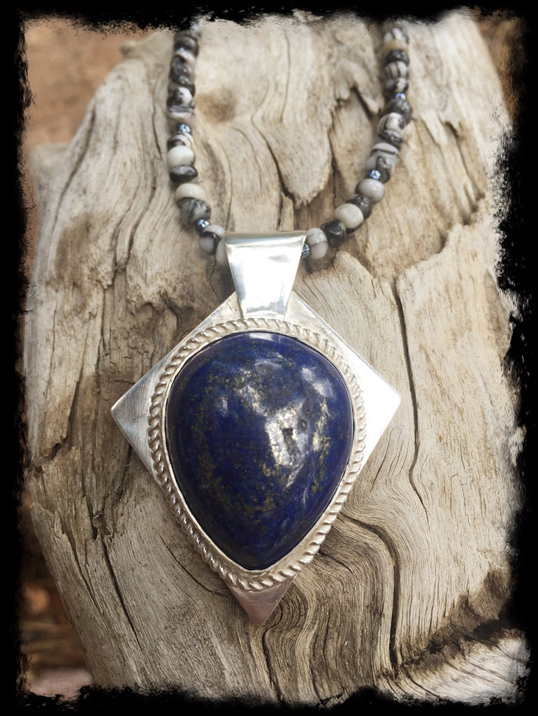This pendant is hand crafted from 925 solid sterling silver. A bezel with rope wire accent surround a large lapis stone that has great character. A hand crafted bezel completes the piece.