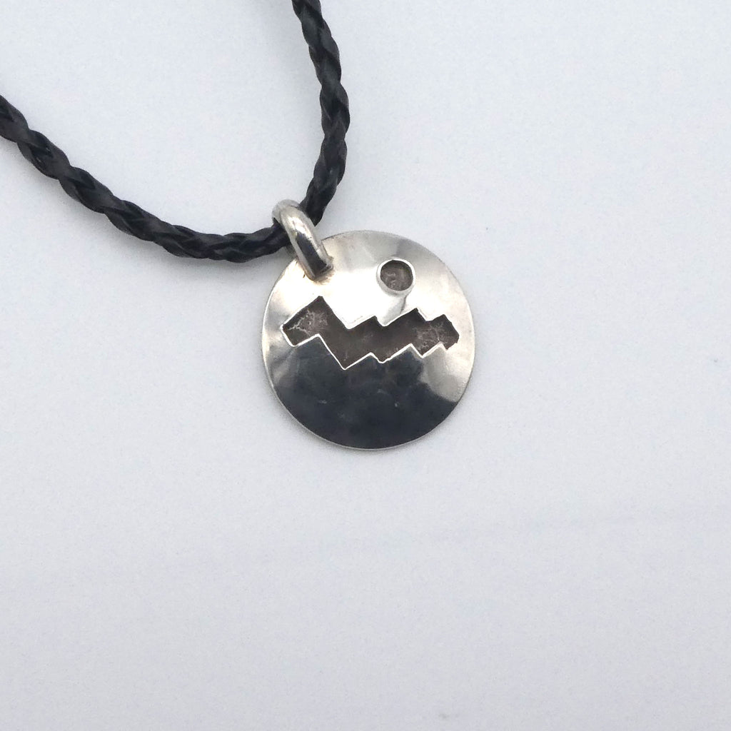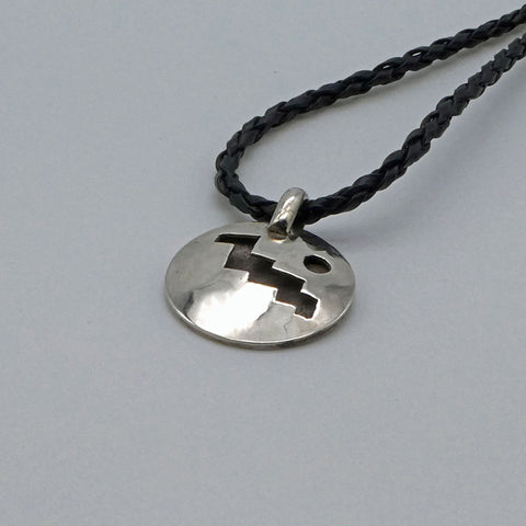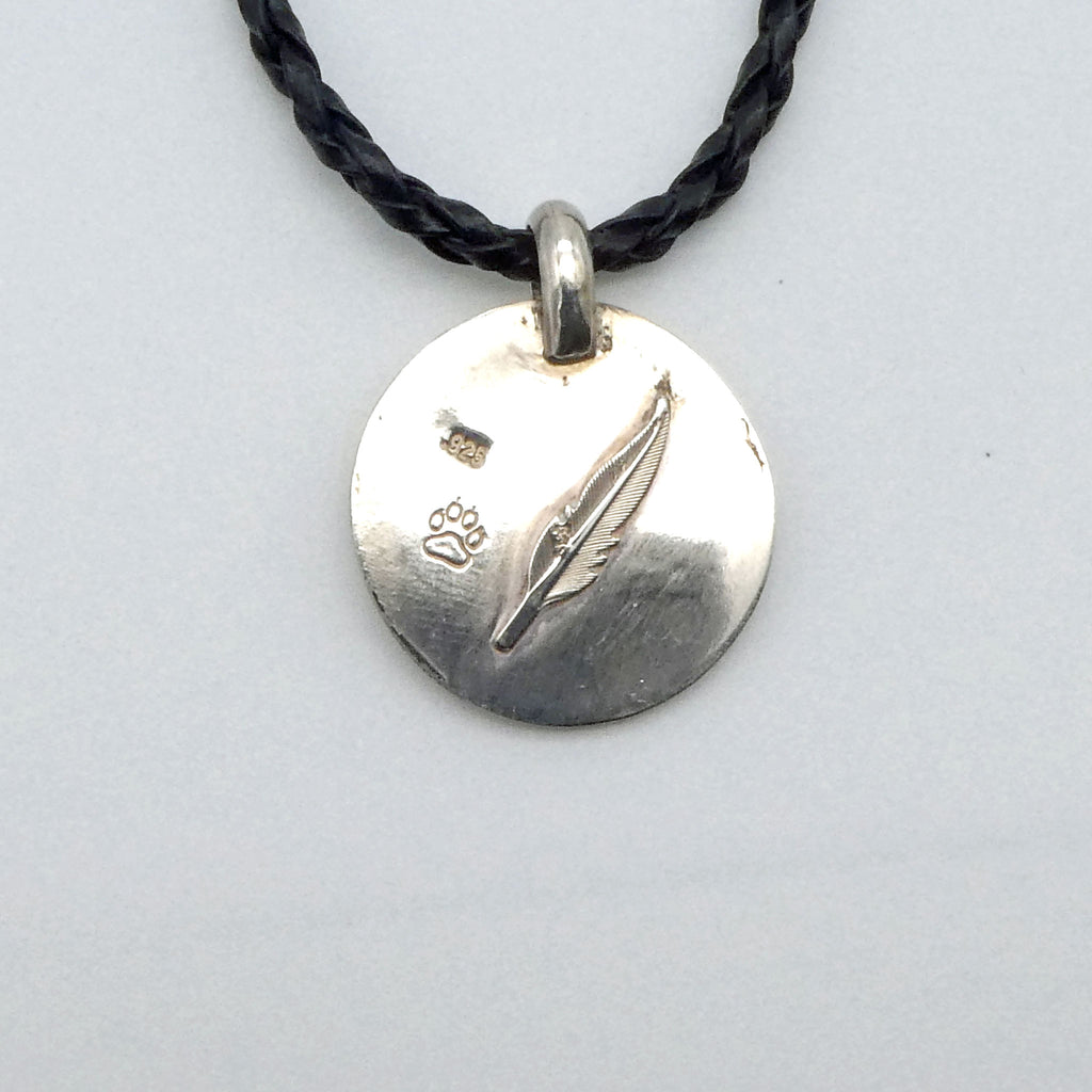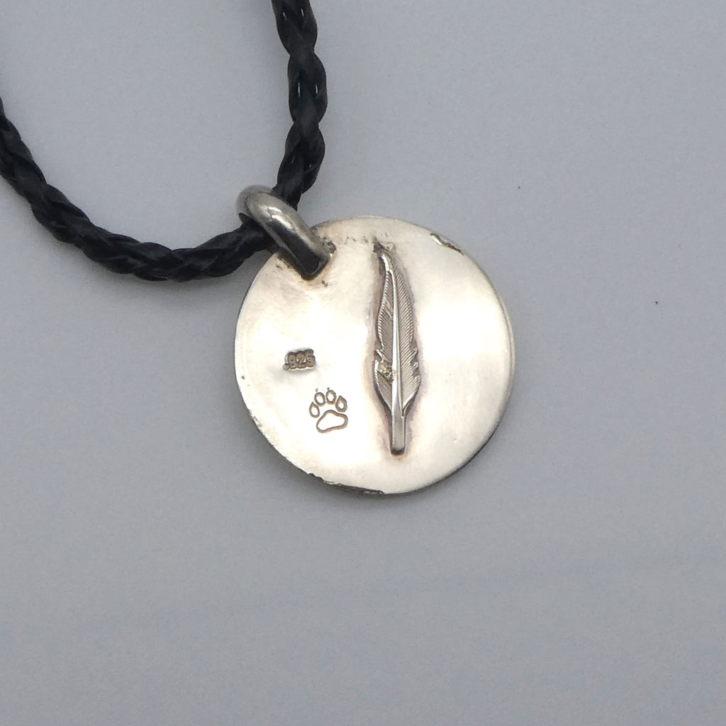 The pendant is solid sterling silver, and is an overlay. The top piece is hand cut and domed, and the back features a feather, another important symbol.The pendant hangs from a simple braided leather cord.