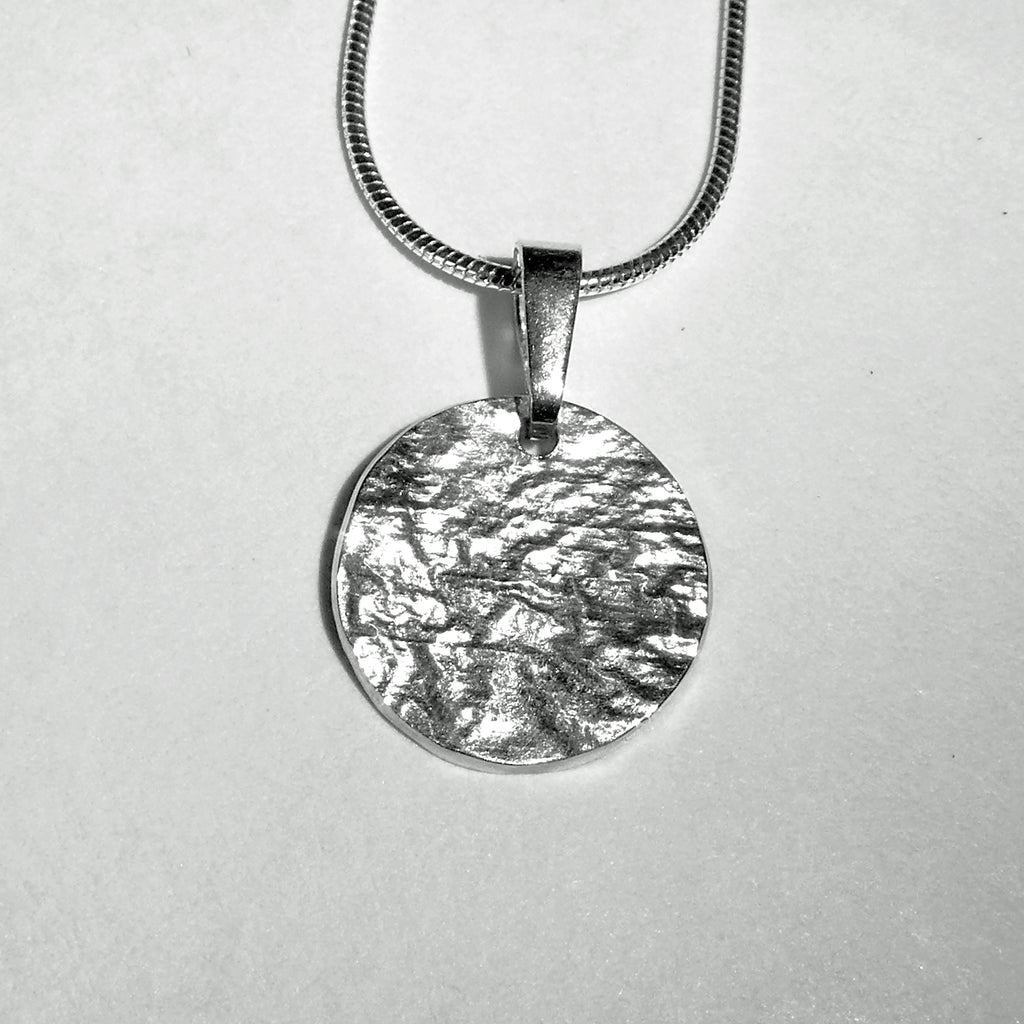 Reticulated silver is .935 silver content, and acts quite differently under the torch than .925. It takes on a life of its own, moving and shaping into very individual patterns each time. This necklace is named "Luna" as it reminds me of the surface of the moon! Mother Nature makes each one different, yours will be similar to this one.