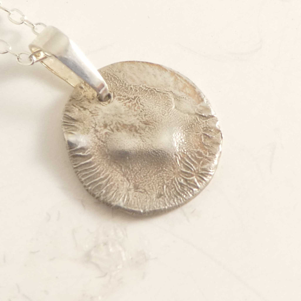Reticulated silver is .935 silver content, and acts quite differently under the torch than .925. It takes on a life of its own, moving and shaping into very individual patterns each time. This necklace is named "Luna" as it reminds me of the surface of the moon! Mother Nature makes each one of these different, yours will be similar in design.