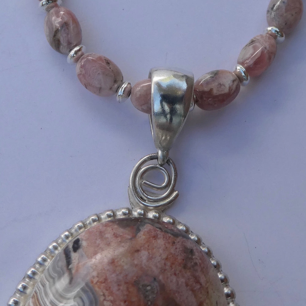 The pendant hangs from a hand beaded Rhodochrosite and sterling silver bead strand, measuring 16" in length.
