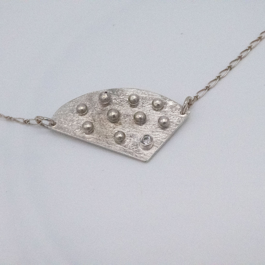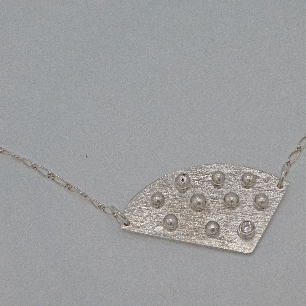 This unusual design has a 2.5mm clear CZ surrounded by nine balls, all in solid sterling silver. The pendant hangs from a dainty sterling silver chain, and can be worn in either orientation.