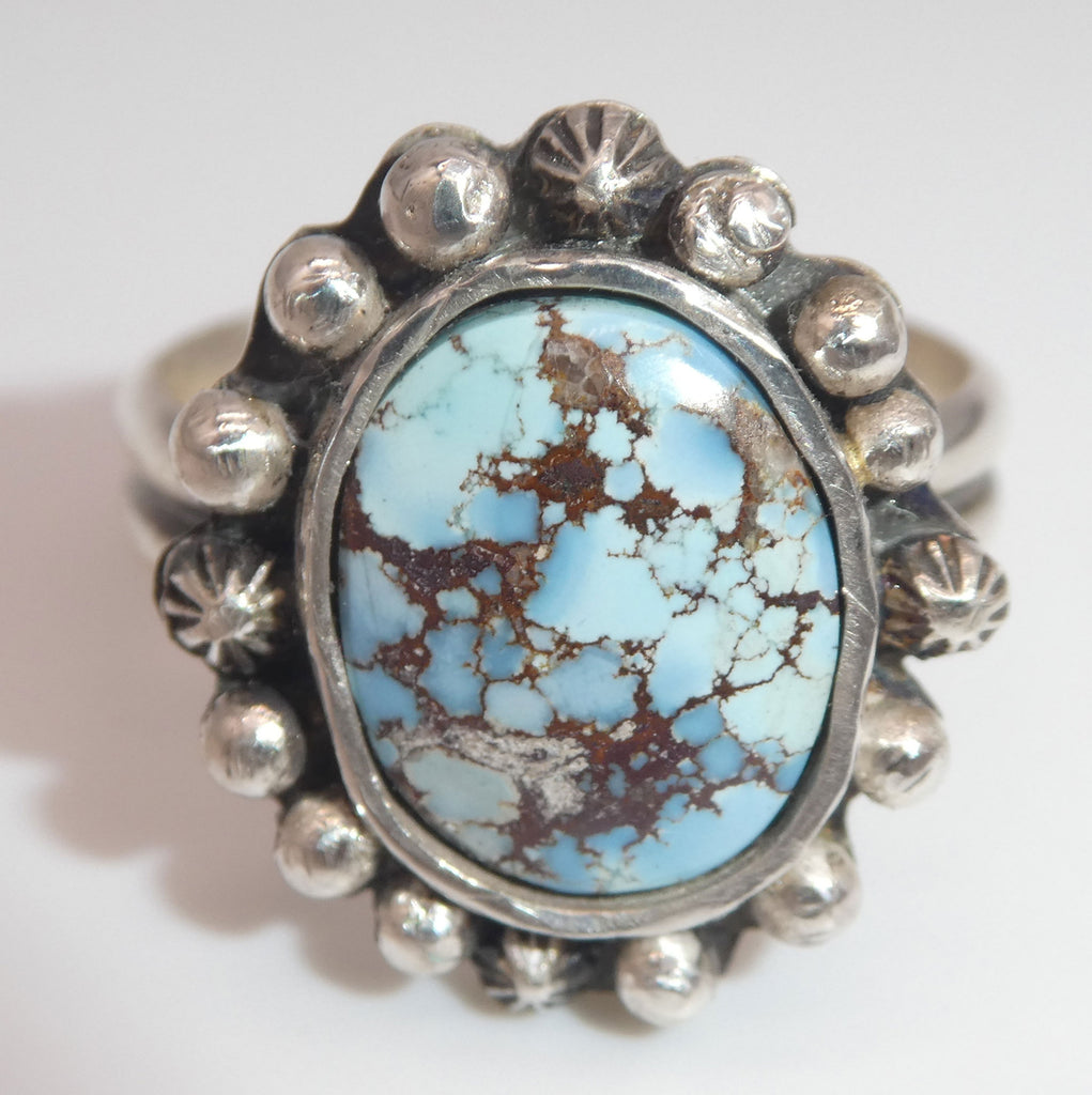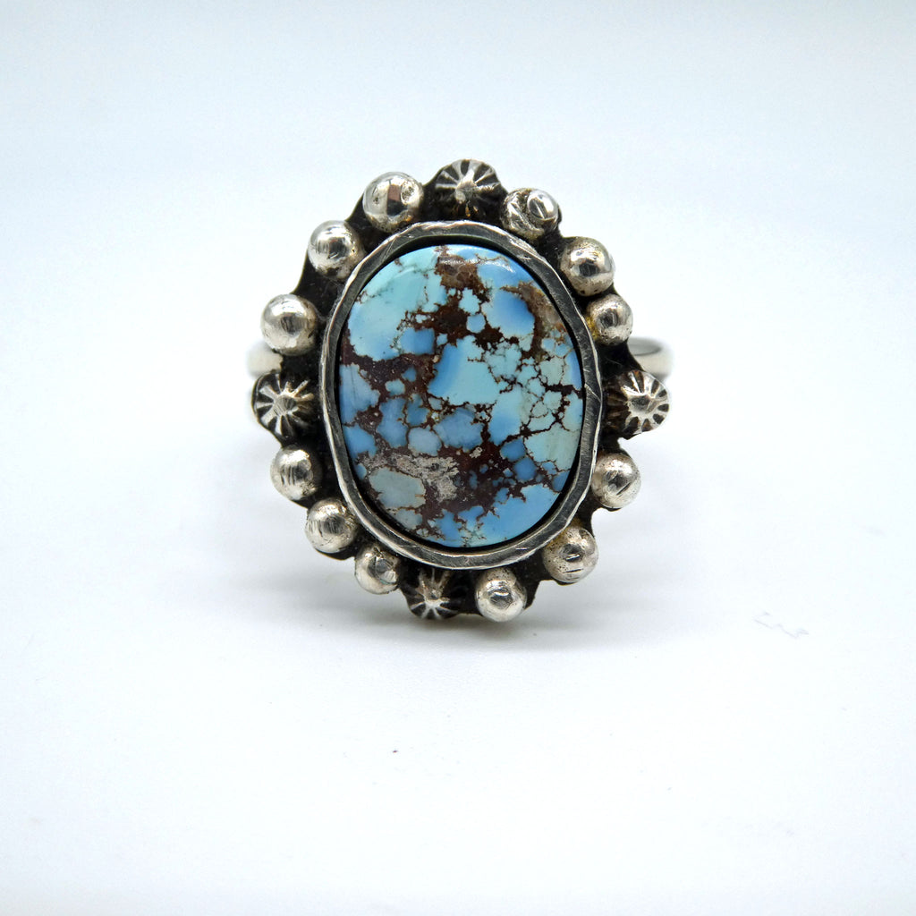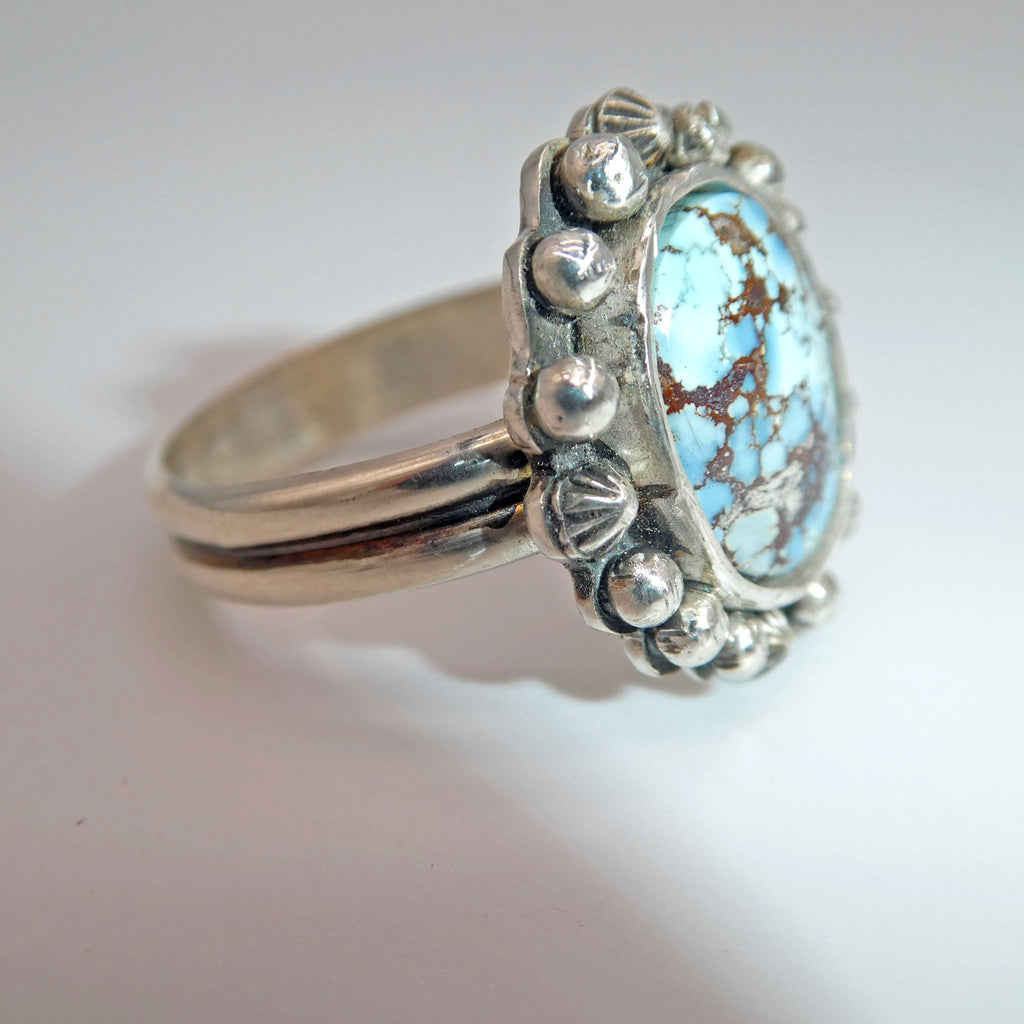 The stone is bezel set, and surrounded by embellishments, then oxidized to make the whole design pop. The ring is a size 7 1/2, and is solid .925 sterling silver.