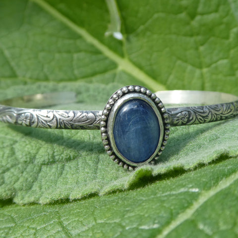 An oval Kyanite in a stunning blue is captured by a beaded bezel.