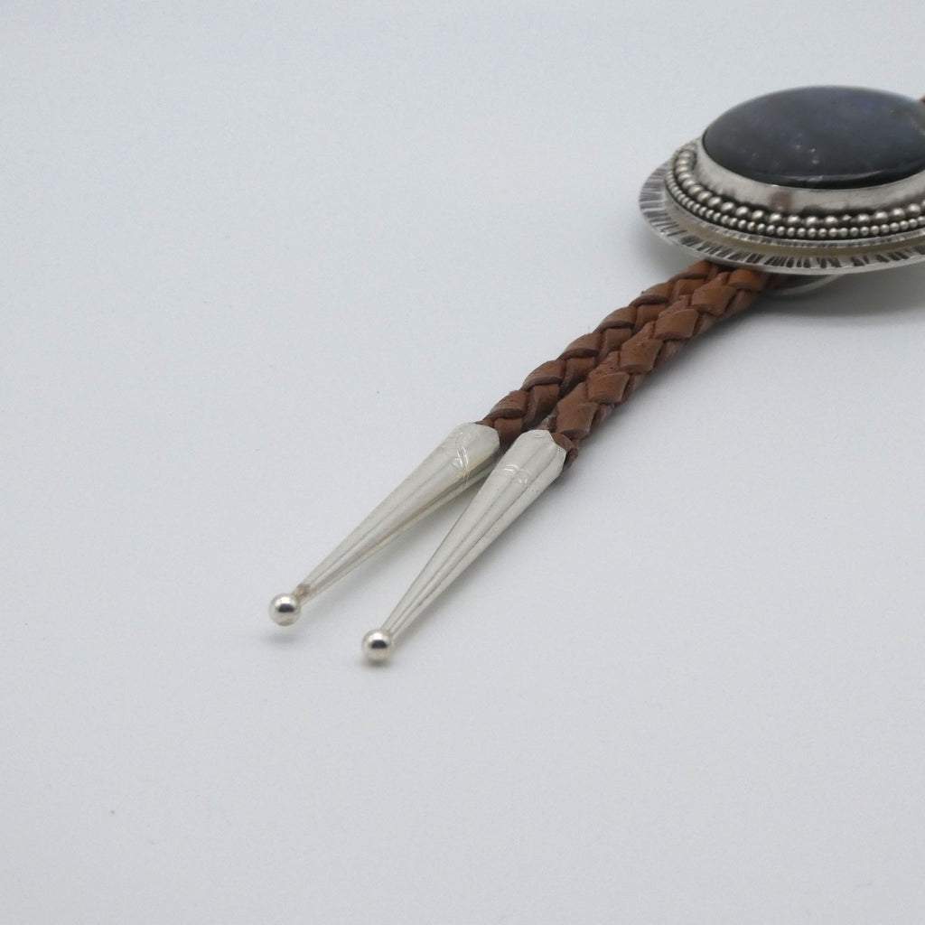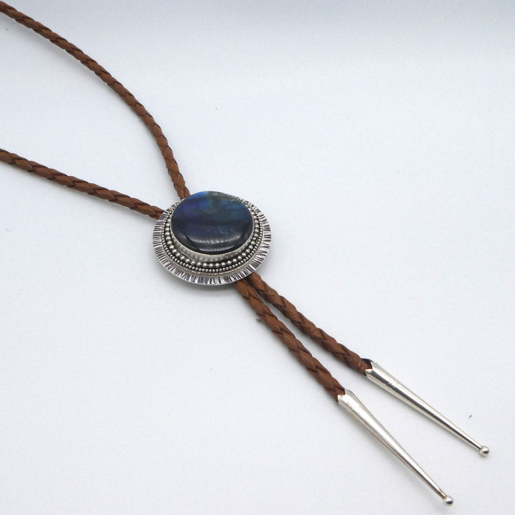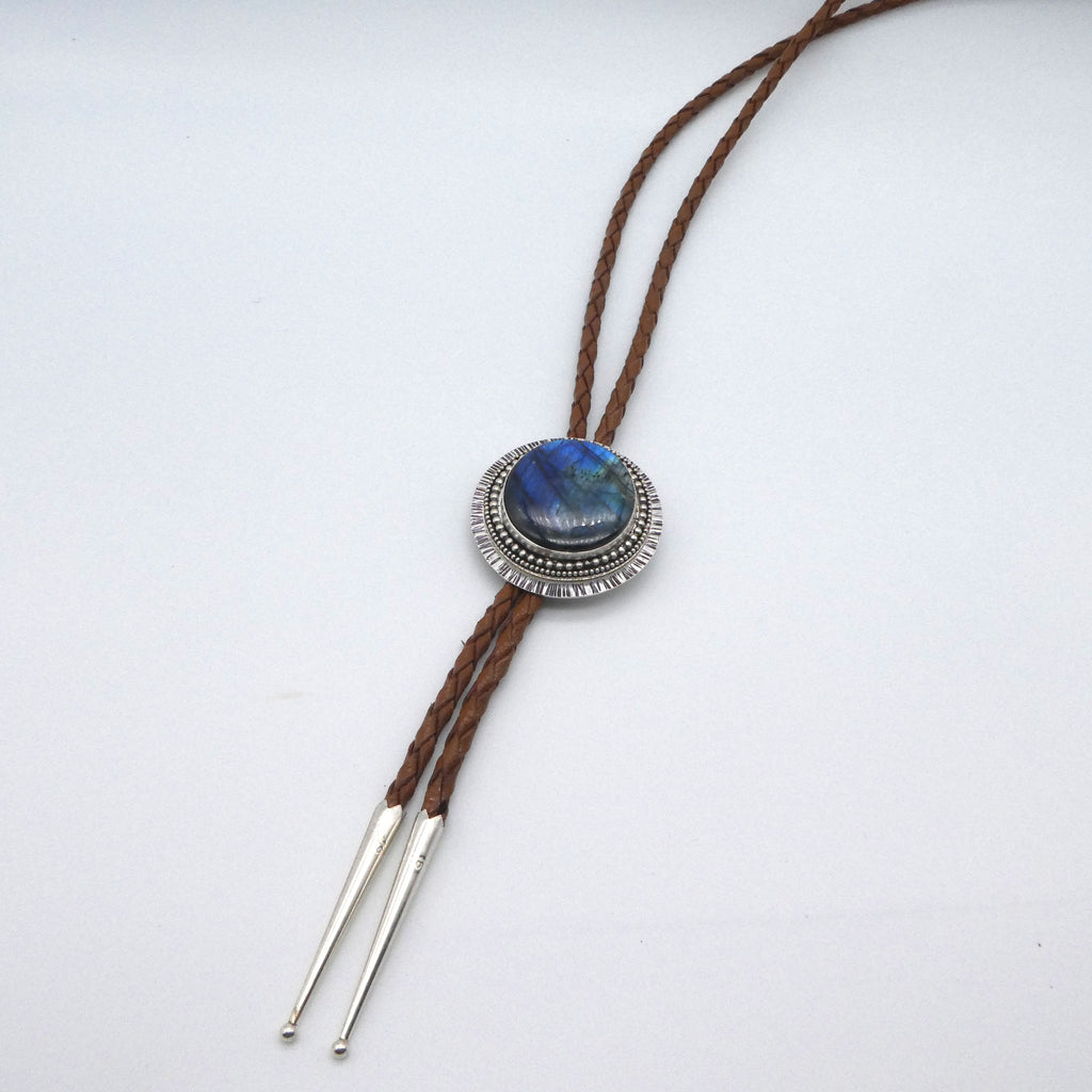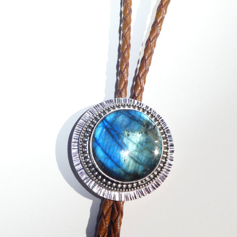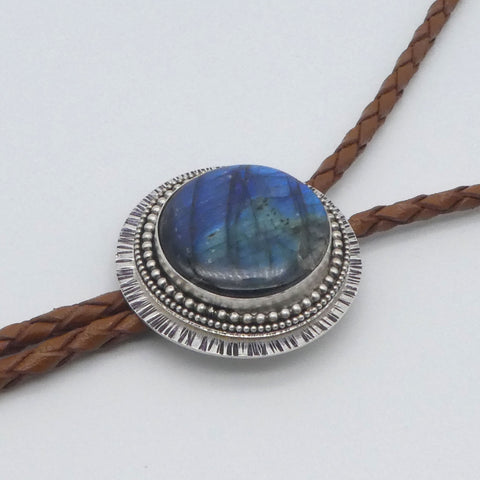 The stone is a beautiful round Labradorite, with wonderful flash. The bolo is actually two levels, the stone and bezel are raised, giving the piece a unique three dimensional quality. The stone is surrounded by two different sizes of beads, and the outside reveal is hand hammered.