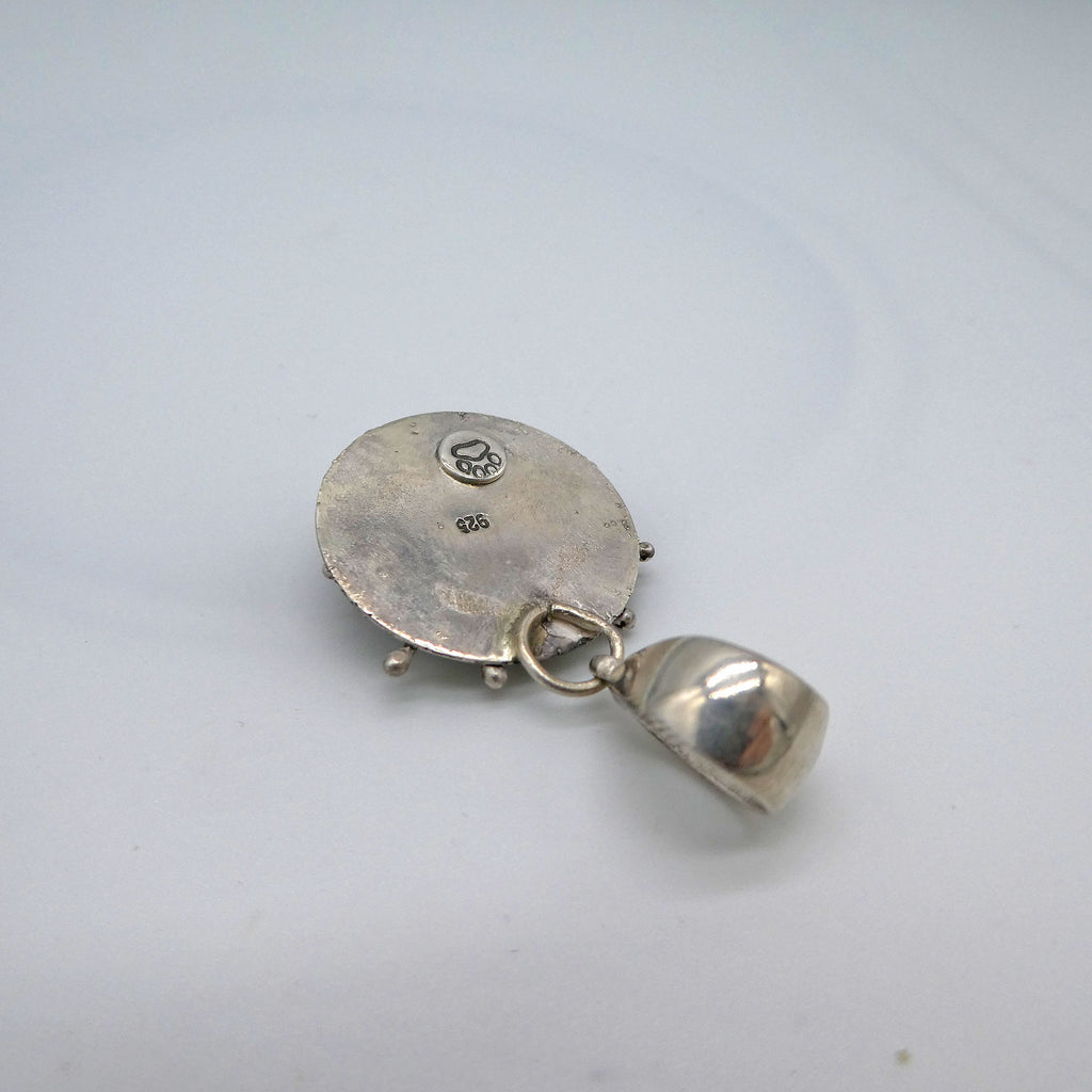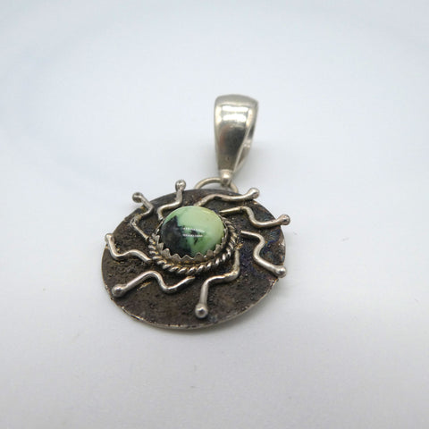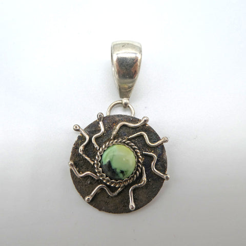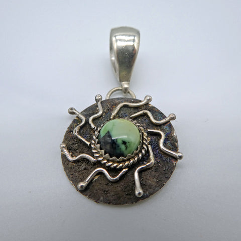This pendant is a 7/8 inch solid sterling silver disk which has been granulated for a great texture under the black oxidation. The center stone is a pretty 8mm variscite, surrounded by bits of wire randomly placed.
