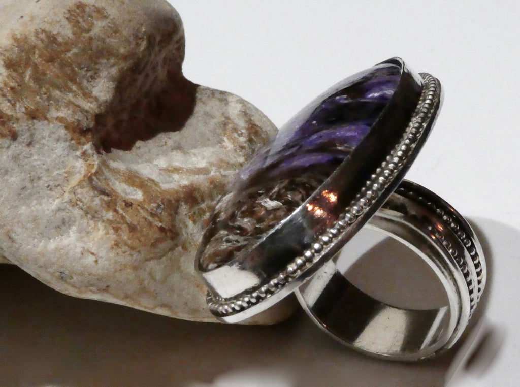 This beautiful Charoite stone is 50 carats, and is showcased in a hand crafted heavy sterling silver statement ring in a size 9. The bezel has beaded sterling silver accent, as well as strands of sterling silver beads around the shank.
