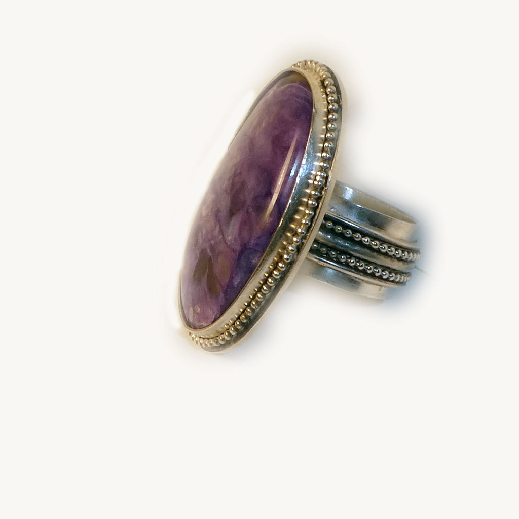 This beautiful Charoite stone is showcased in a hand crafted heavy sterling silver statement ring in a size 7 1/2. The bezel has beaded sterling silver accent, as well as bands of sterling silver beads around the shank.
