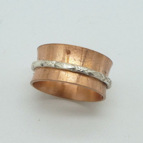 My version of the spinner ring - textured copper with sterling silver spinner with a pretty pattern. This ring is all handcrafted by me in my studio, and is a size 6 1/2.
