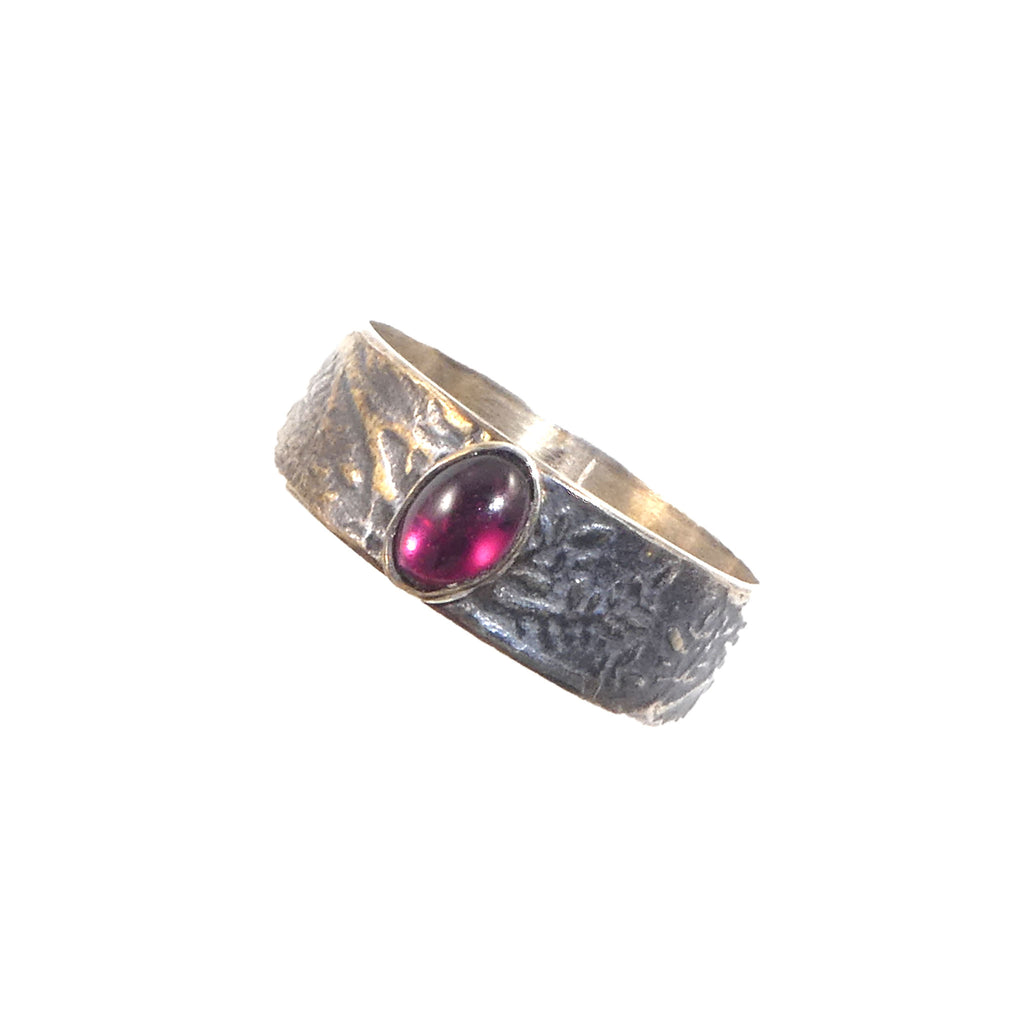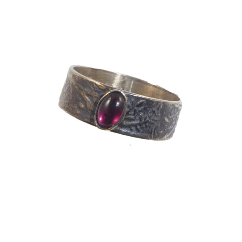 Garnets come in a variety of shades, this stone is a lighter color, and catches the light very nicely. The 4x6mm cabachon stone is bezel set in solid sterling silver. The ring has a pretty branch design imprinted into the solid sterling silver band, and it is a size 8.