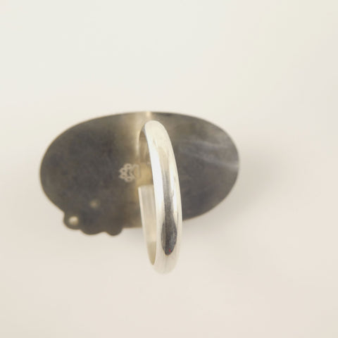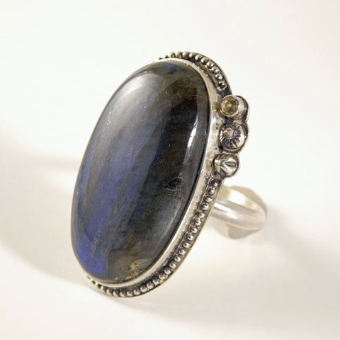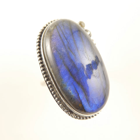 This labradorite has lots of flash! It is a large stone captured in a statement ring in size 9 1/2. The setting is solid stering silver, and shows off the stone with a 2.5 mm clear CZ, bead wire and shot adornments.