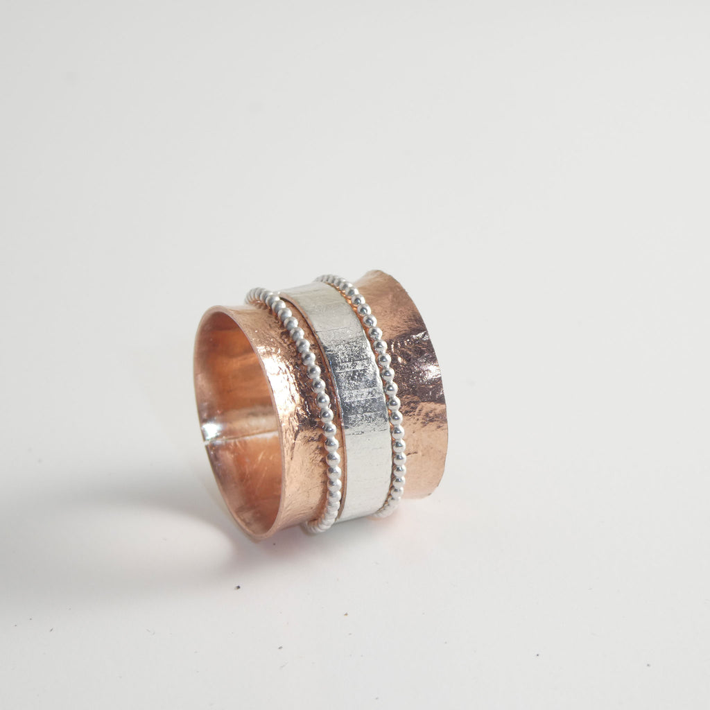 This take on the spinner ring has a textured solid copper main band, flared to capture three solid sterling silver spinner bands of different textures. The ring is a size 6 3/4. The copper will naturally patina with wear, into a beautiful copper hue.