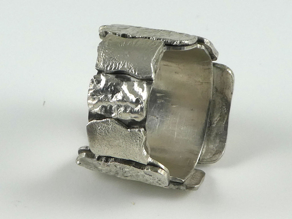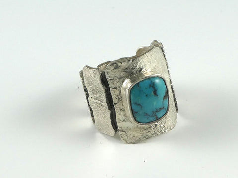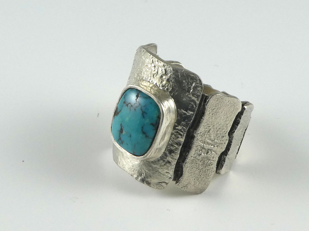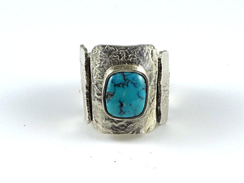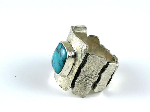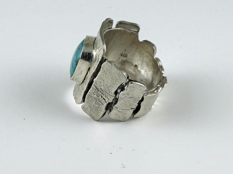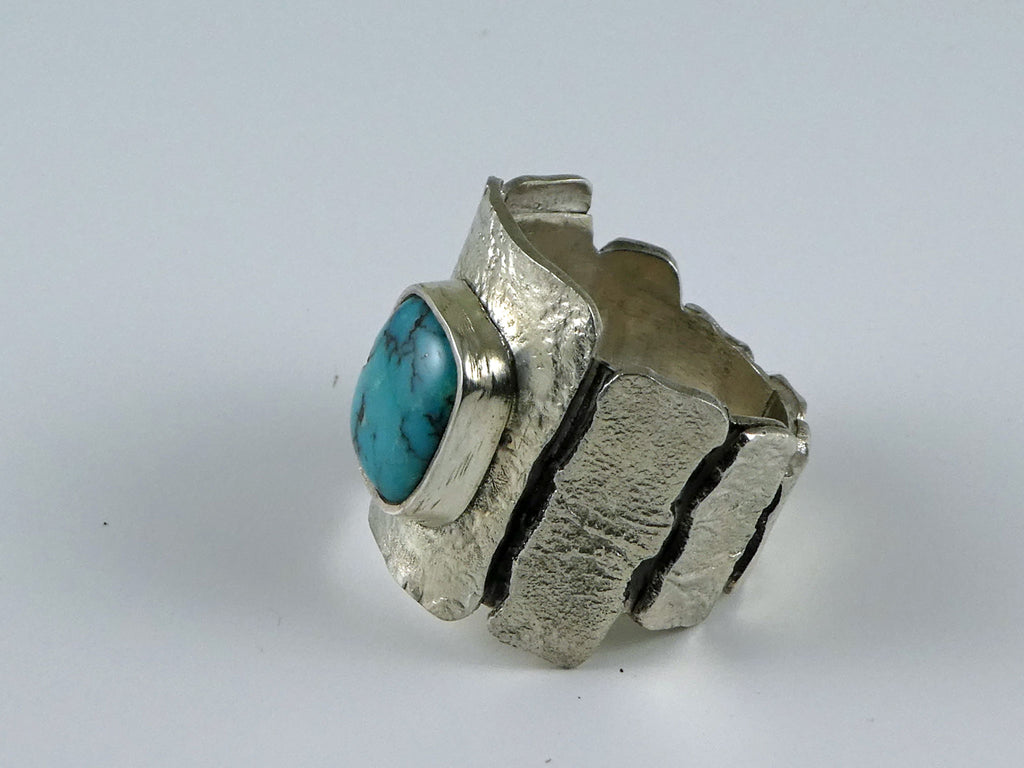 This heavy statement ring has a free form turquoise cabachon bezel set on a series of reticulated 'tiles' which surround the entire shank of the ring.