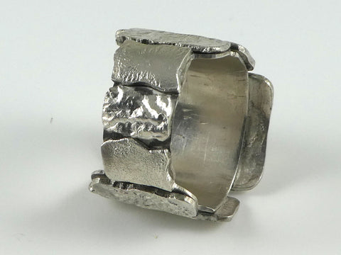 Reticulation involves repeated heating and cooling of the sterling silver with a torch in order to bring the silver to the top 'crust' of the metal. The metal is then painted with the torch, chasing the surface into unusual and unique textures.
